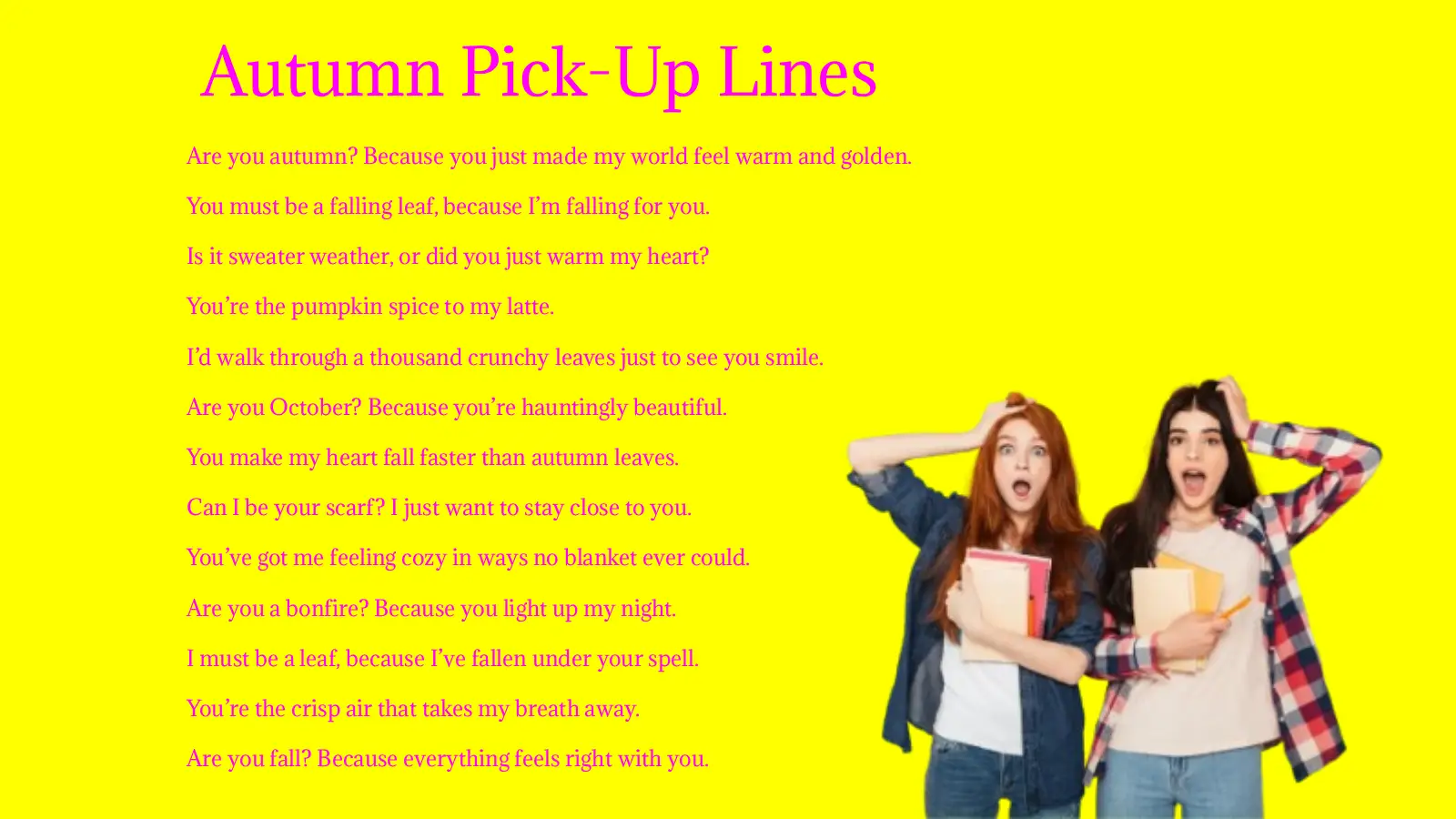 Want to make someone smile this autumn? 🍁💛 These pick-up lines are flirty, fun, and full of seasonal charm. We’ve ...