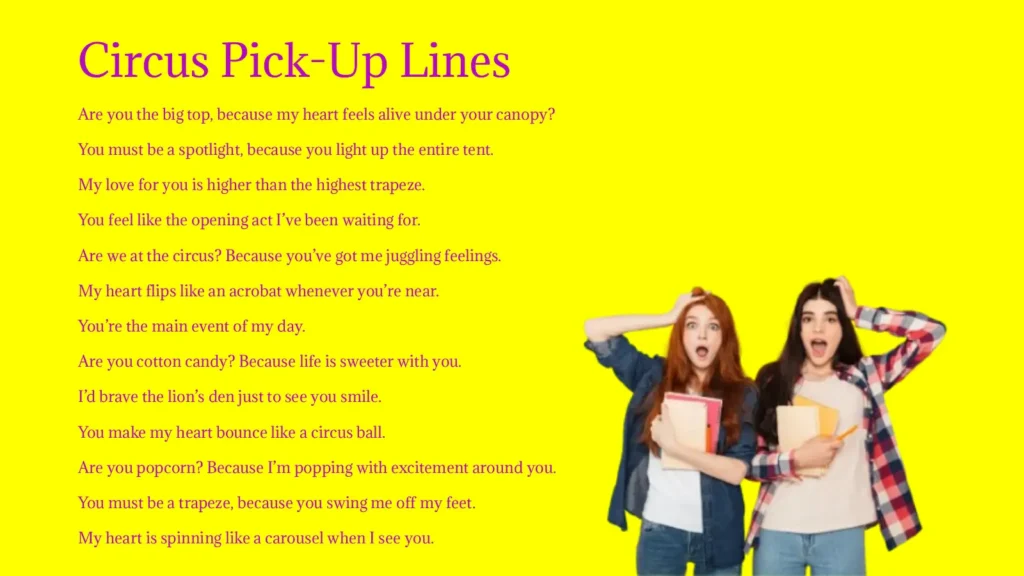 Circus pick-up lines aren’t just about clever words—they’re about fun, charm, and a sense of adventure. From high-flying trapeze acts to sweet cotton candy moments, each line is designed to spark a smile, break the ice, and bring a little circus magic into everyday interactions.