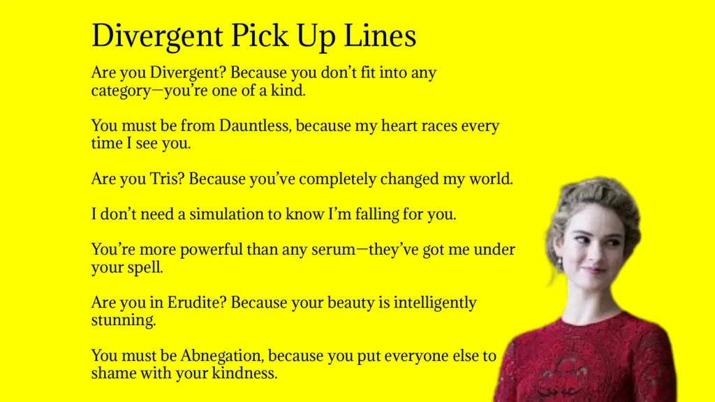 Divergent pick up lines are flirty, funny, or romantic lines inspired by the Divergent series, its factions (Dauntless, Erudite, Abnegation, Amity, Candor), and characters like Tris and Four. They blend dystopian themes with modern “rizz.”