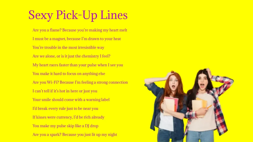 Sexy pickup lines are playful, flirty, and slightly bold phrases used to express attraction in a fun and confident way. They are designed to spark interest, create laughter, and make conversations more exciting without being disrespectful.